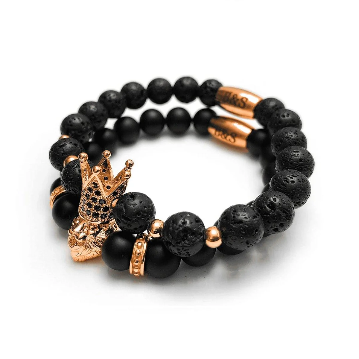 The Rose Gold Crowned Lion Set features two beaded bracelets that are perfectly coordinated, yet each one is unique. One bracelet is composed of natural volcanic stones, while the other is made of black lava stones with rose gold-plated details. The subtle differences in texture and color create a harmonious look that's both elegant and chic.